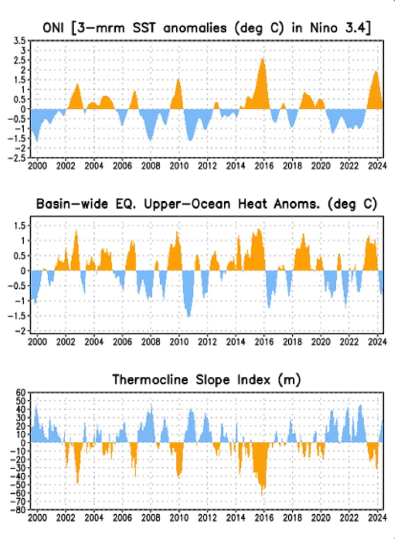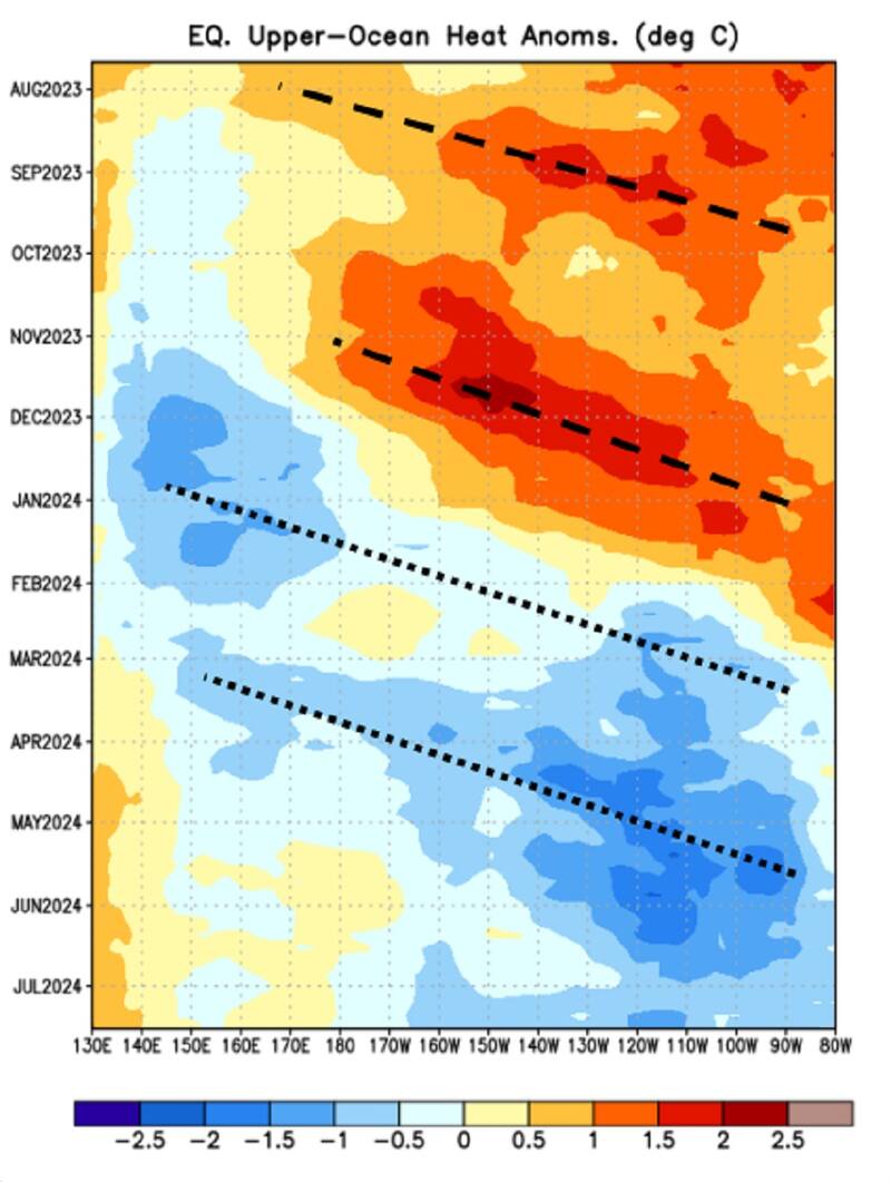 El documento también menciona que durante el período que se muestra, se ha observado una importante actividad de ondas Kelvin oceánicas ecuatoriales (líneas discontinuas y punteadas). Hasta enero de 2024, persistieron temperaturas subsuperficiales superiores a la media en la mayor parte del océano Pacífico, cuando El Niño estaba en su apogeo. Pero el informe dice que luego se observaron dos ondas Kelvin ascendentes durante diciembre de 2023 y mayo de 2024. “Desde marzo de 2024, han persistido temperaturas subsuperficiales por debajo de la media en el Pacífico oriental, pero se están debilitando gradualmente”, sostiene la NOAA.