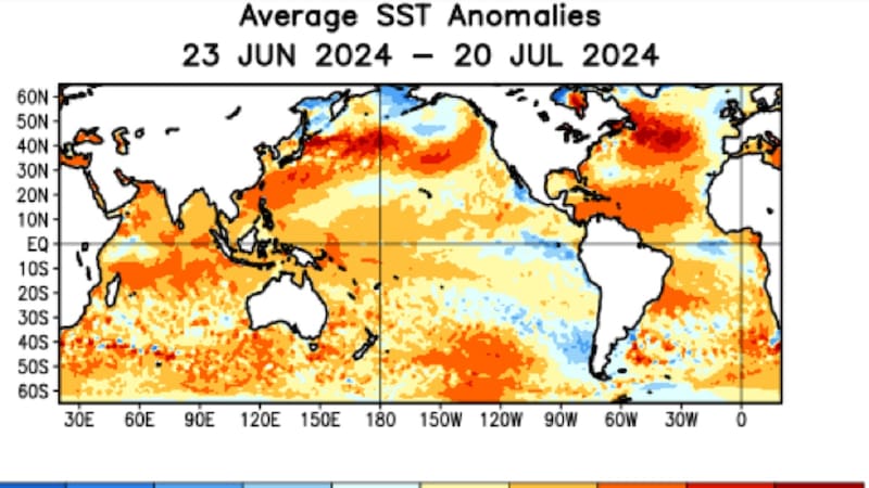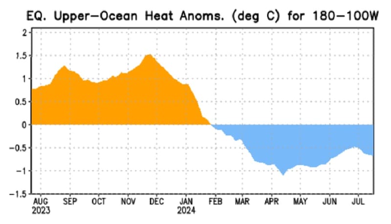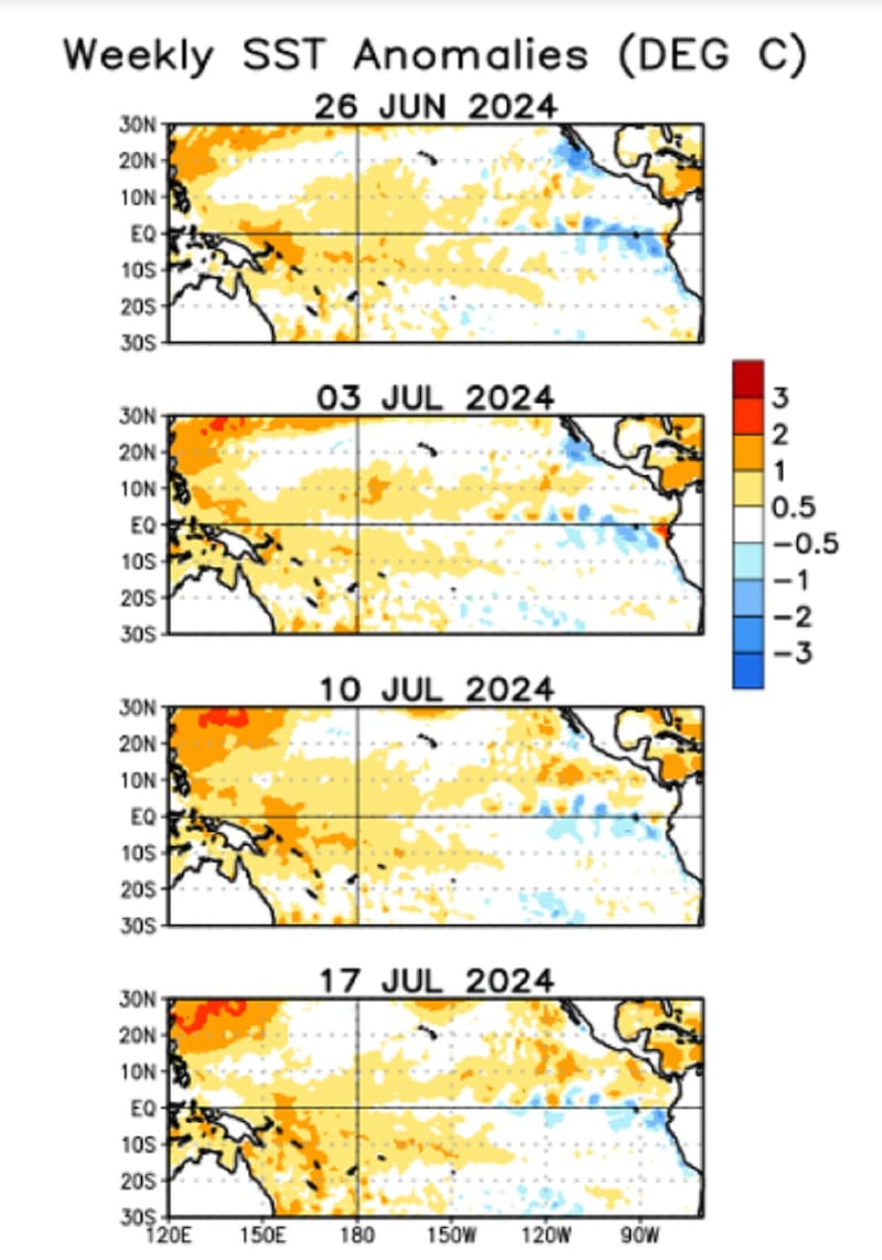 Desde principios de julio de 2024, se observaron anomalías negativas en el Pacífico occidental y central.