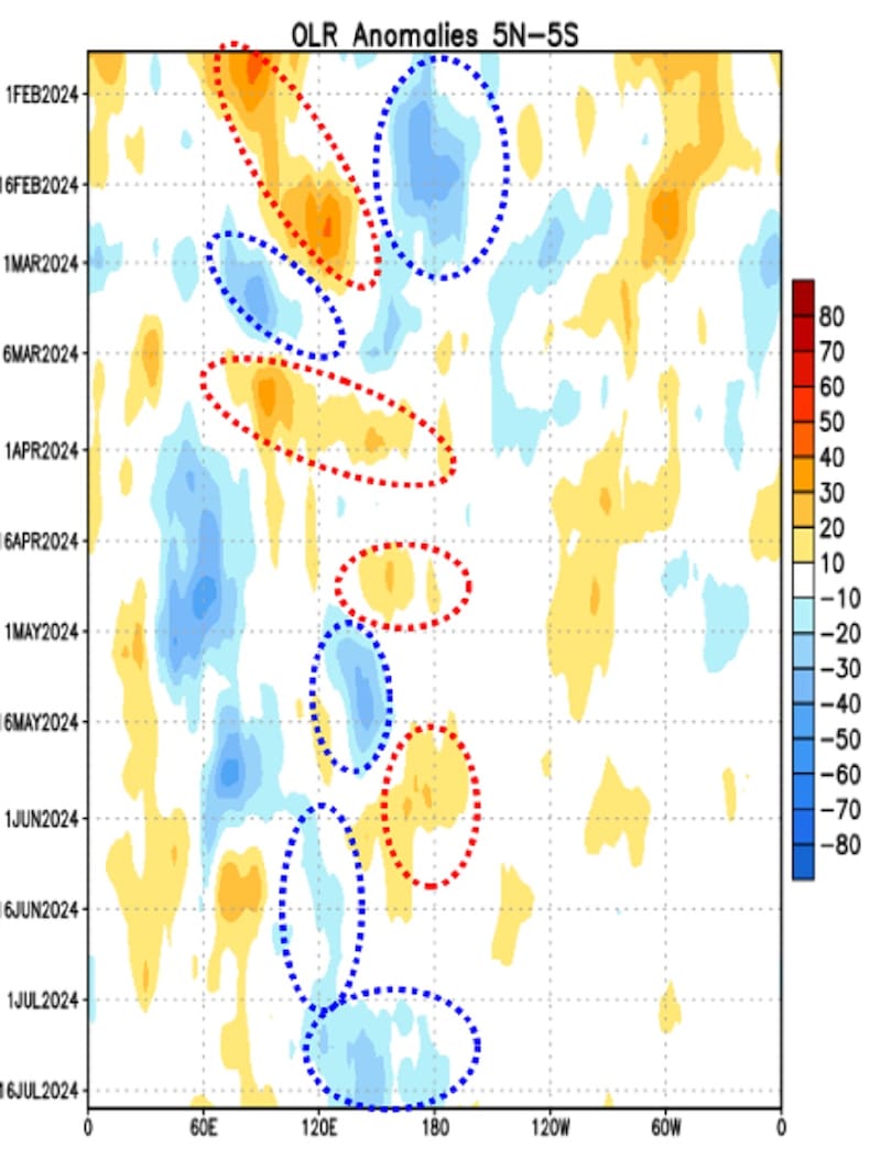 Desde mediados de diciembre de 2023 hasta marzo de 2024, las anomalías de OLR se desplazaron hacia el este desde el Océano Índico/Indonesia hasta el Pacífico occidental/Línea de cambio de fecha.