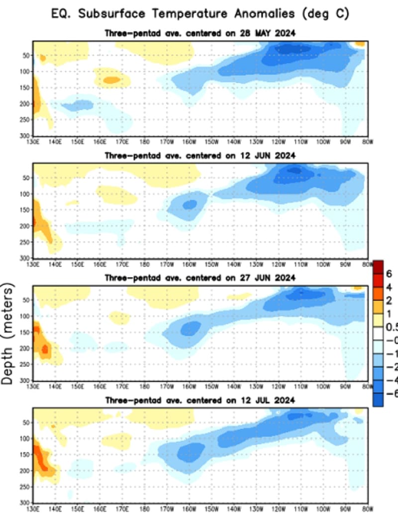 En otro de los gráficos se muestra cómo las temperatura del subsuelo oceánico también ha disminuido. “Las anomalías positivas de la temperatura del subsuelo persistieron hasta mediados de enero de 2024. La variabilidad de las anomalías positivas se asoció con varias ondas Kelvin oceánicas. A partir de noviembre de 2023, las anomalías positivas de la temperatura del subsuelo se debilitaron hasta casi cero. Desde fines de enero hasta mediados de abril de 2024, surgieron y se fortalecieron anomalías negativas de la temperatura. Desde julio de 2024, las anomalías negativas han persistido”, señala el informe de la NOAA.