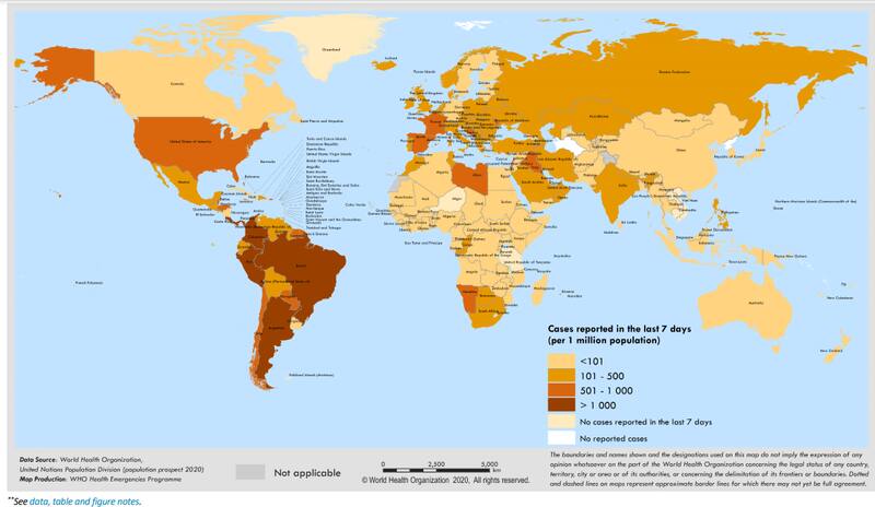 La Organización Mundial de la Salud (OMS) presentó un nuevo mapa sobre la actual situación del virus Sars-CoV-2 en el mundo.
