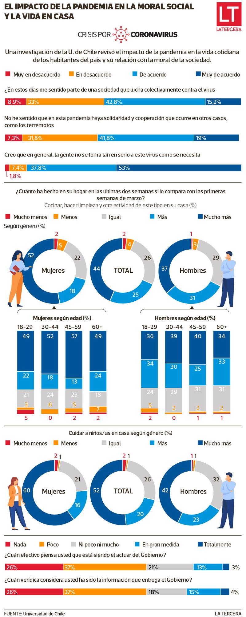 El 63% de las personas cree que el actuar del gobierno es poco o nada efectivo, mientras que el 66% señala que ha sido poco o nada confiable. Es más, el 63% considera poco o nada verídica la información que entregan las autoridades.