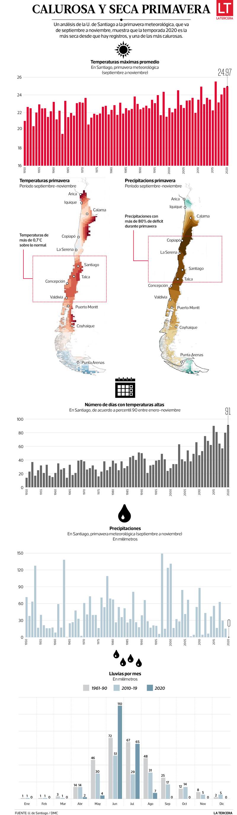 Hace tiempo que la expresión “clima primaveral” dejó de tener sentido para Santiago. La temperatura máxima de la primavera 2020 es la segunda más cálida desde que hay registros, solo superado por la del año 2016 y las precipitaciones en la capital para el mismo período fueron las más bajas jamás registradas.