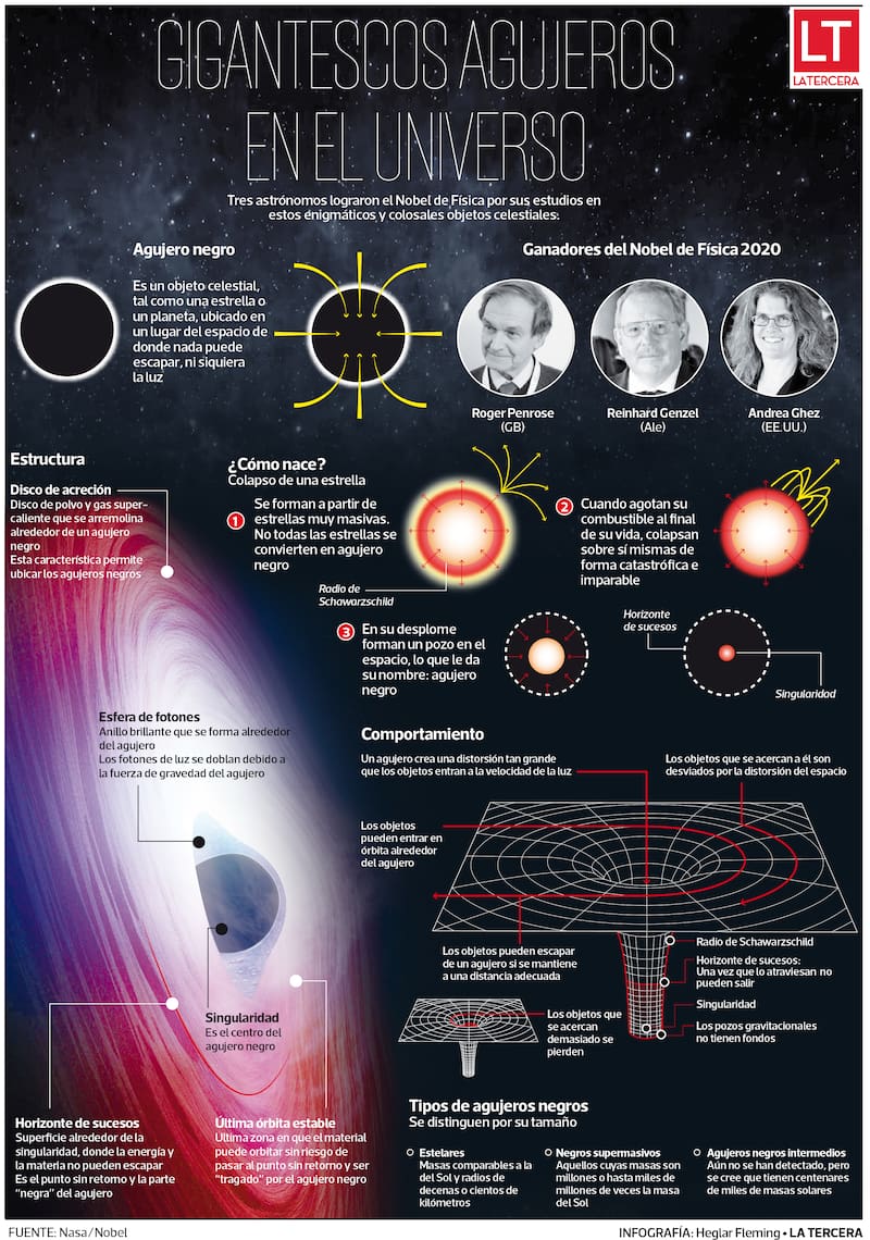 De acuerdo al jurado del Nobel, el británico Roger Penrose (89) fue galardonado “por el descubrimiento que la formación de un agujero negro es una predicción sólida de la teoría general de la relatividad”, mientras que el alemán Reinhard Genzel (68) y la estadounidense Andrea Ghez (55) fueron reconocidos "por el descubrimiento de un objeto compacto supermasivo en el centro de nuestra galaxia”.
