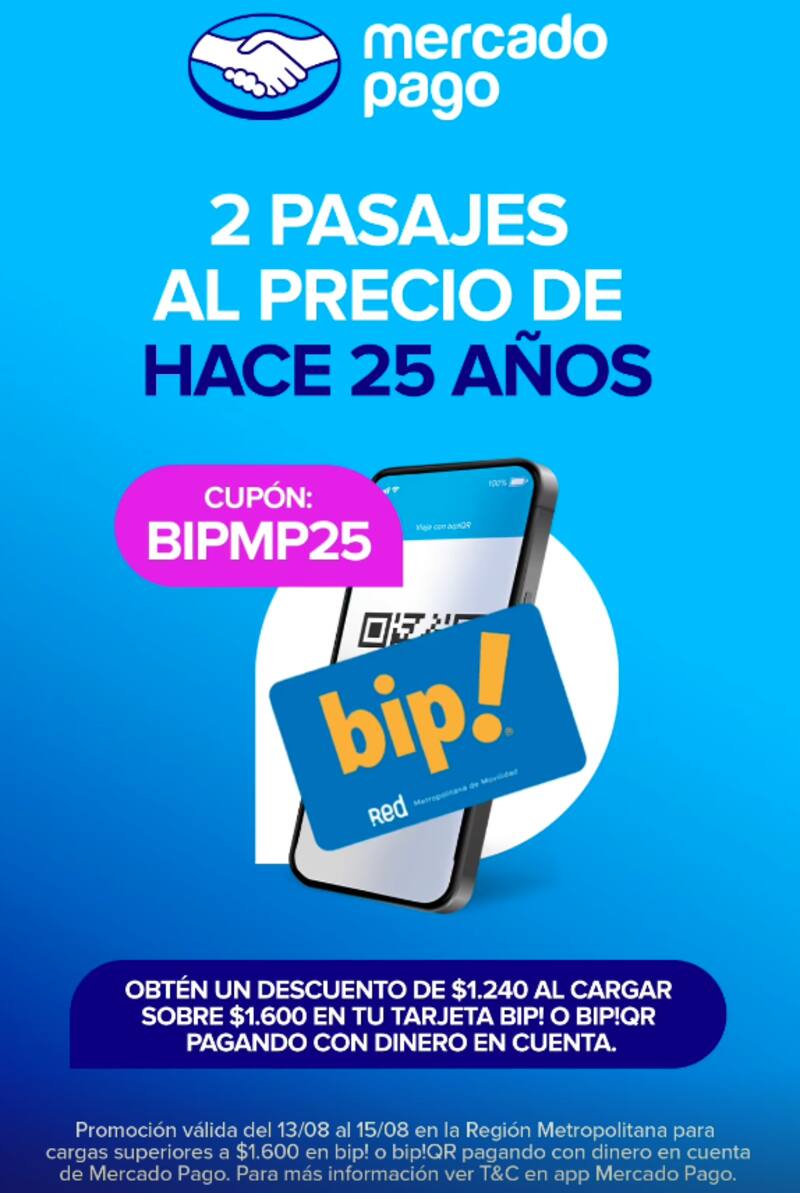 El descuento para viajar en micro y metro por $220 se realiza a través de la aplicación de Mercado pago, ingresando el cupón “BIPMP25″ al recargar saldo para la Tarjeta Bip! o a la cuenta Bip!QR.