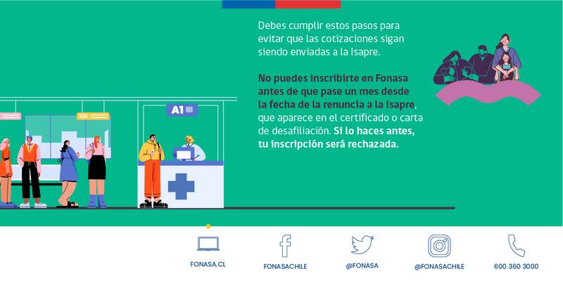 Cabe destacar que la cobertura de la Isapre continúa por un mes adicional a la fecha de desafiliación. No se puede inscribir en Fonasa antes de que pase un mes desde la fecha de renuncia a la Isapre que aparece en el certificado o carta de desafiliación. Si se realiza antes, la inscripción será rechazada.
