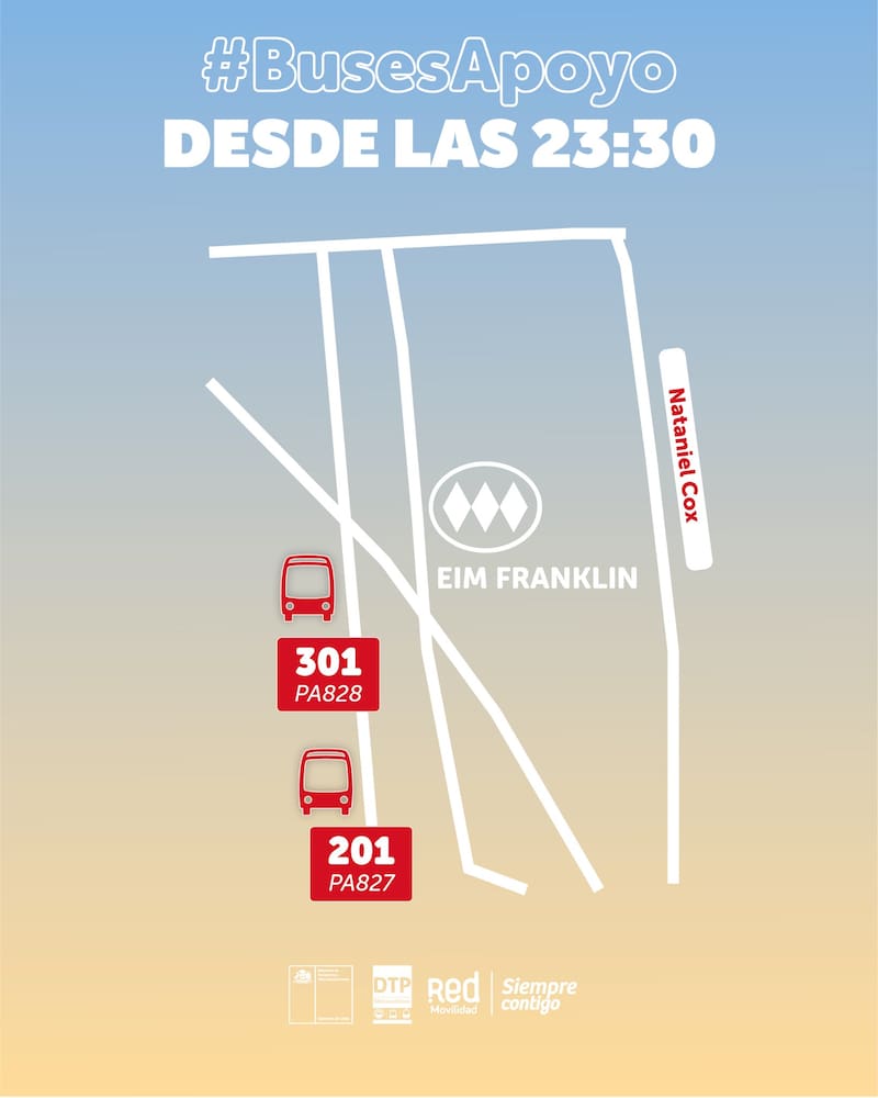 Y también incorporará buses de apoyo desde la estación de Metro Franklin, también desde las 23:30 horas, hacia la comuna de San Bernardo.
