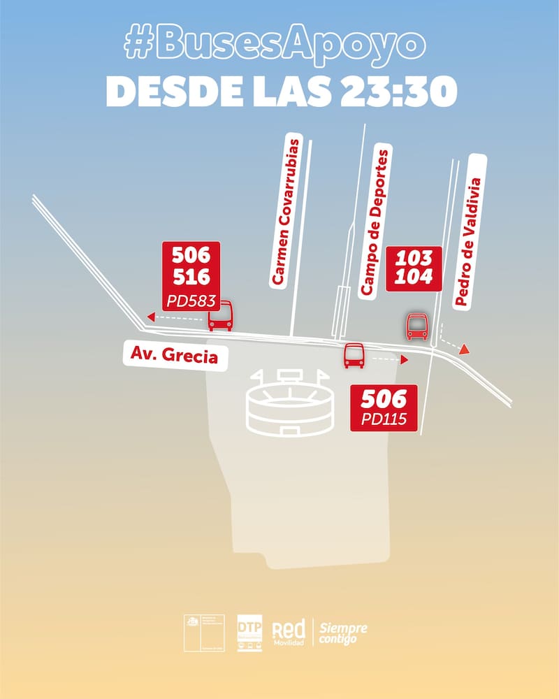 En tanto Red anunció que desde las 23:30 horas habrán buses de apoyo desde el sector del Estadio Nacional con destino a Peñalolén, La Florida, Puente Alto, Maipú, Pudahuel y a la Alameda.