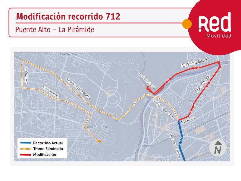 - Recorrido 712: modifica su trazado en ambos sentidos, dejando de transitar por Recoleta y Conchalí. Ahora este recorrido conecta a las comunas de Puente Alto y Vitacura, circulando por Av. Vitacura, Luis Pasteur y Av. Santa María.
