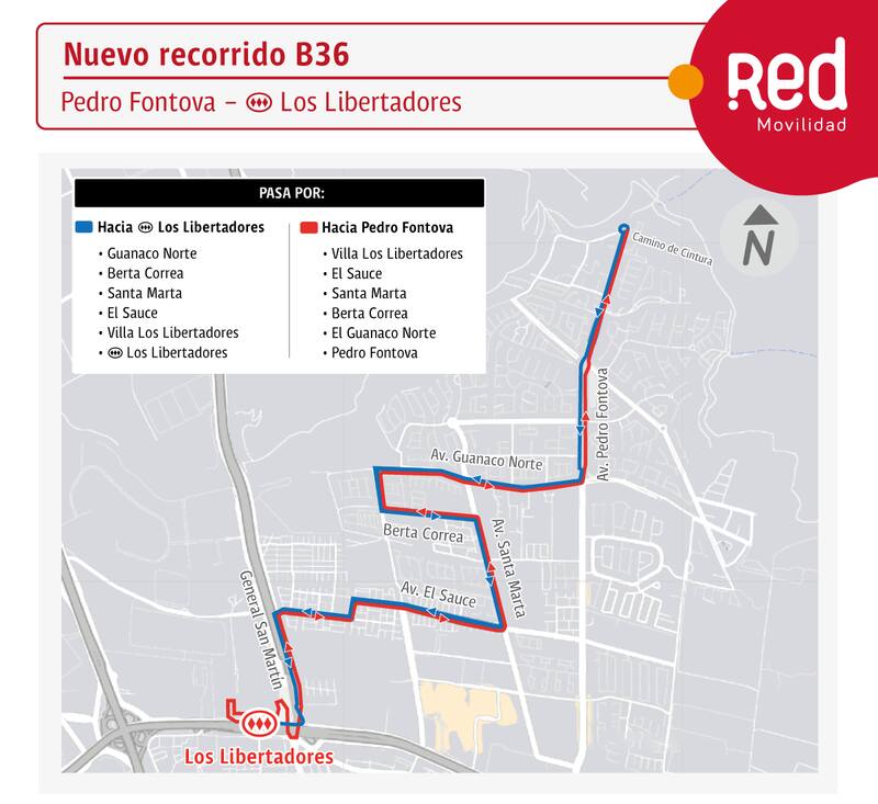 - Recorrido B36: entrega servicio entre la Estación Intermodal Los Libertadores y Pedro Fontova, transitando por las Villas Los Libertadores y Santa Marta, en la comuna de Huechuraba.