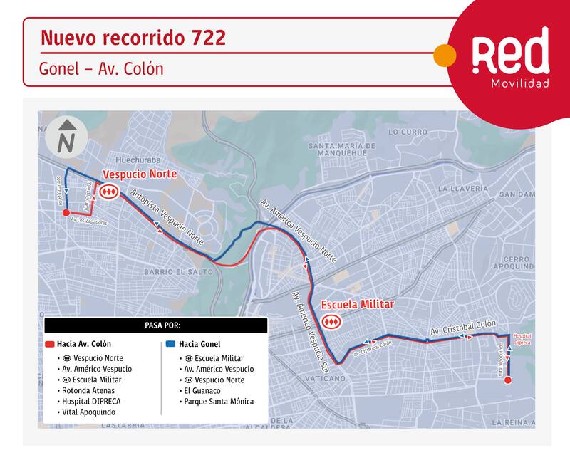 - Recorrido 722: funciona entre El Guanaco y Av. Cristóbal Colón, entrega a los vecinos y vecinas de las comunas de Conchalí, Las Condes, Vitacura y Recoleta conexión directa con las estaciones de Metro Vespucio Norte y Escuela Militar. El servicio cubre el tramo donde deja de transitar el recorrido 712.