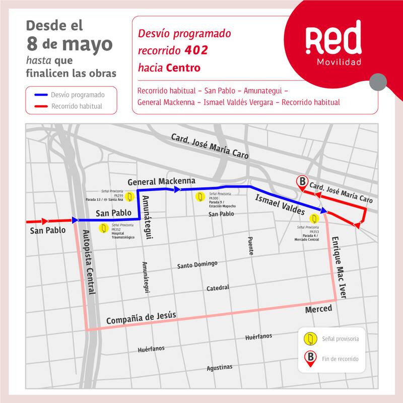 Recorrido 402: que cuenta con un itinerario habitual hacia el centro por San Pablo-Amunátegui-General Mackenna e Ismael Valdés Vergara.