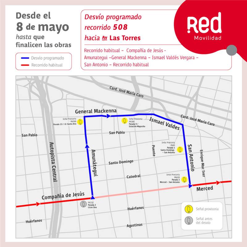 La Red Metropolitana de Movilidad, informó los recorridos del transporte público que cuentan con desvíos a partir del lunes 8 de mayo, programados en las calles de Santiago.