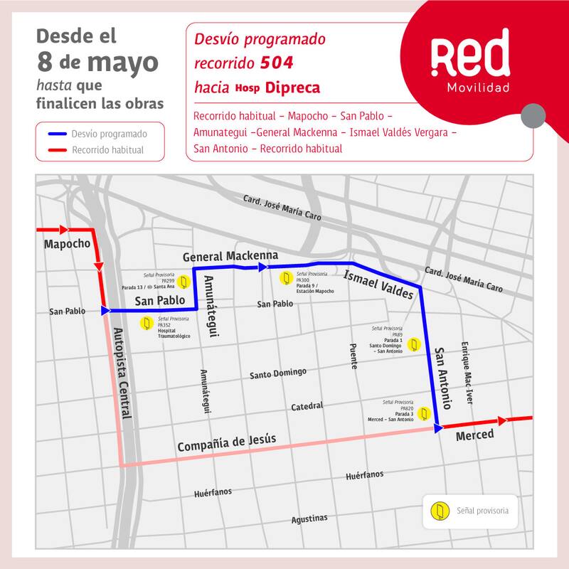 Recorrido 504: cuenta con un camino acostumbrado hacia el Hospital Dipreca por San Pablo-Amunátegui-General Mackenna-Ismael Valdés Vergara y San Antonio.