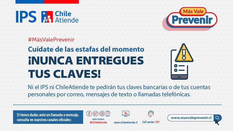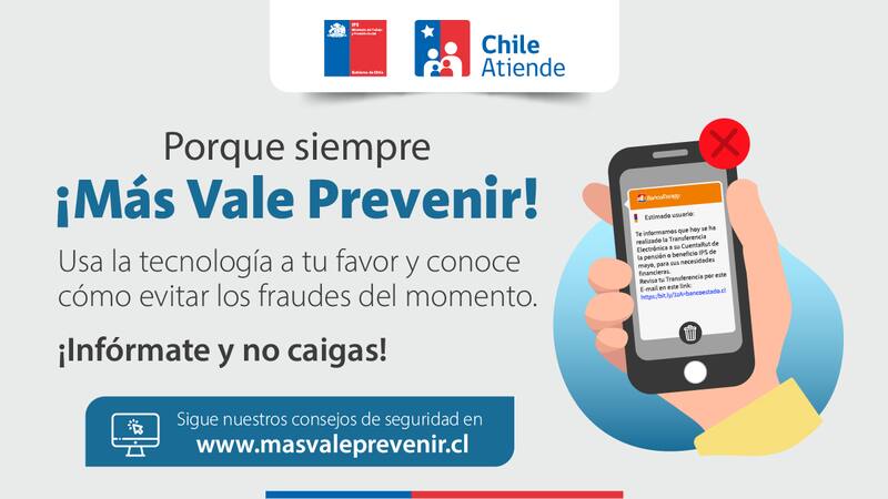 En el marco de la campaña “Más vale prevenir”, se crea una iniciativa impulsada por ChileAtiende y el Instituto de Previsión Social (IPS), que busca alertar a usuarios sobre los actuales fraudes online, por mensajes de texto y llamadas telefónicas.