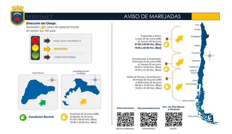 El Centro Meteorológico Marítimo de Valparaíso emitió este sábado un aviso de marejadas con dirección suroeste que afectará las costas del país, desde Arica hasta el Golfo de Penas, incluyendo el archipiélago de Juan Fernández.