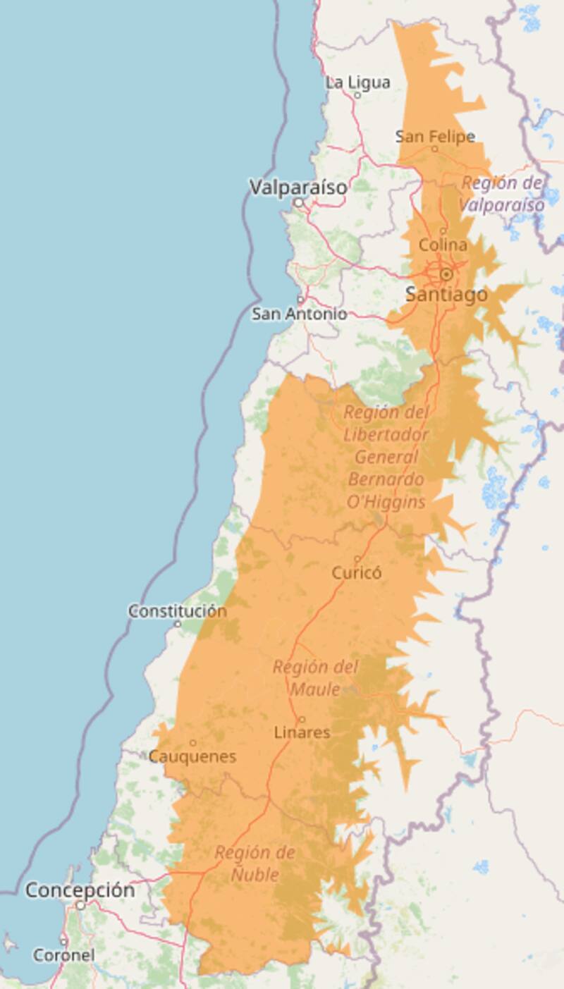 - Región del Maule en la cordillera costa, valle y precordillera (hasta 37°C)