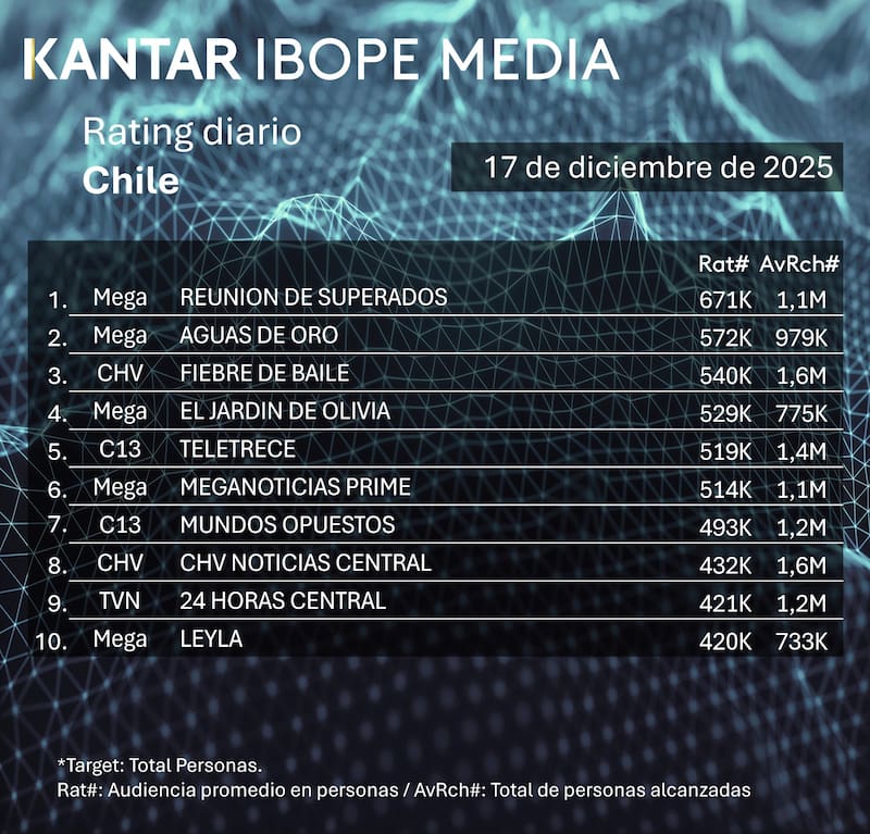 Por Equipo de GrowthRating del miércoles 17 de diciembre en Chile: cómo le fue a CHV, Mega, Canal 13 y TVN