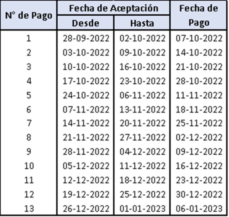 Una vez aceptada la propuesta de devolución, el pago podrá ser recibido por los cotizantes o empleadores en un plazo que varía entre 5 a 10 días hábiles, según la fecha en que haya aceptado la proposición, de acuerdo con el siguiente calendario de pago: