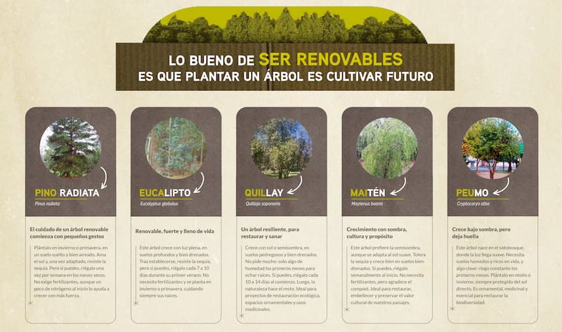 A continuación puedes encontrar información de ARAUCO sobre el cuidado de algunas especies como el Pino Radita, Eucalipto, Quillay, Maitén y Peumo.