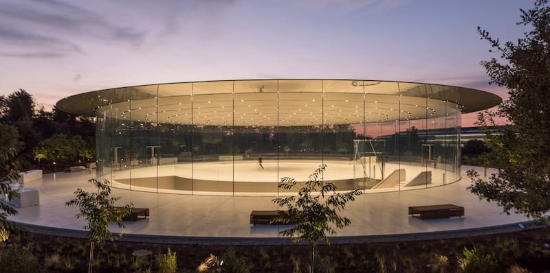 Ubicado en la cima de una pequeña colina del Apple Park, los visitantes son recibidos por un enorme edificio cubierto completamente de paredes de cristal curvo que sostienen un techo de fibra de carbono que pesa más de 73 toneladas.