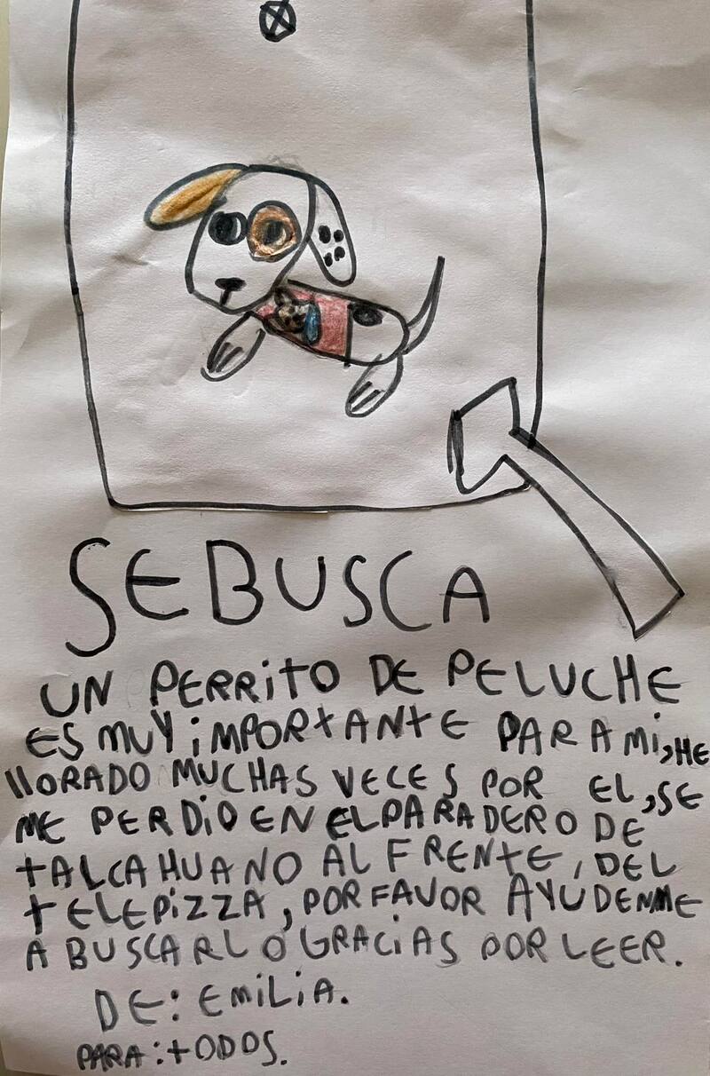 “Se busca un perrito de peluche. Es muy importante para mí, he llorado muchas veces por él, se me perdió en el paradero de Talcahuano, al frente del Telepizza, por favor ayúdenme a buscarlo. Gracias por leer. De Emilia, para todos”, se lee en el cartel que escribió la pequeña.