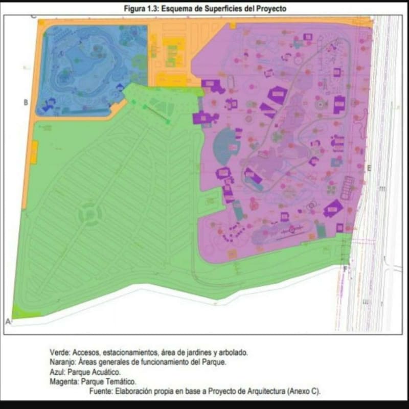 En él, se puede ver el amplia área de estacionamientos, el recinto (de color verde), una segunda área del lugar (morado) donde estarán las atracciones del parque y, finalmente, el espacio para el novedoso Parque Acuático (azul).