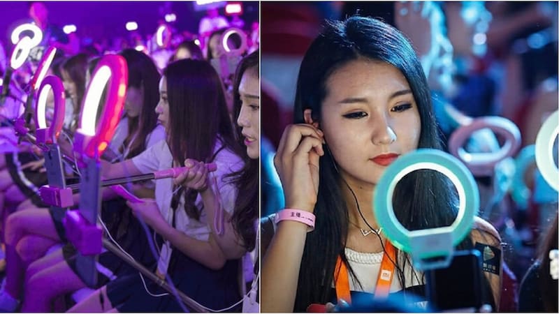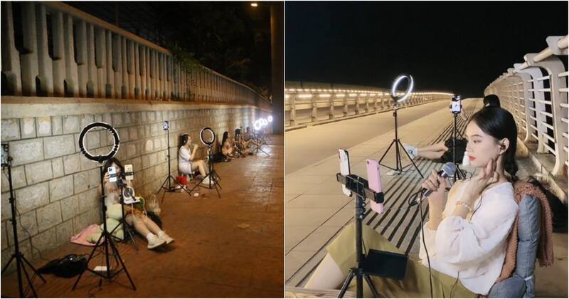 Una multitud de jóvenes se agrupa debajo de una pasarela techada en las calles de Shenzhen, ciudad del sureste de China. Los focos de sus reflectores individuales iluminan sus rostros en medio de la noche, mientras hablan y sonríen fijamente a las cámaras de sus celulares, posicionadas frente a cada una con el apoyo de un trípode.