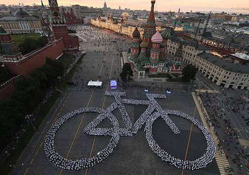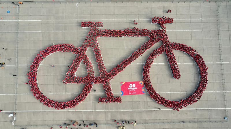 Con drones volando sobre la cabeza de las personas, todas se posicionaron en sus lugares. Algunas eran las ruedas, otras el sillín, el marco y el manubrio. Y aunque no contaban como persona, también había perros, vistiendo la polera roja y apoyando la causa.