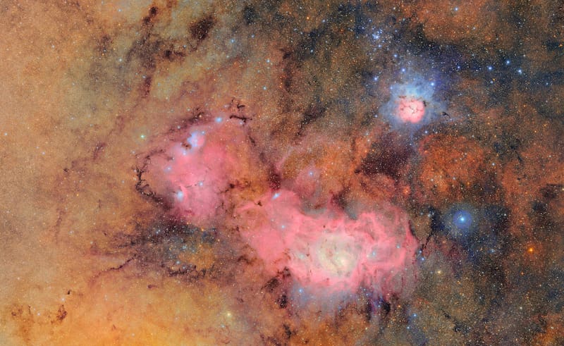 Una de las primeras imágenes es una composición de 678 exposiciones tomadas en solo siete horas, que captura la Nebulosa Trífida y la Nebulosa Laguna, ambas a varios miles de años luz de la Tierra, brillando en vivos tonos rosados sobre un fondo rojo anaranjado.