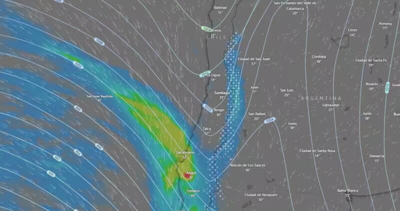Sáez explica a La Tercera que “el escote de la muerte” se percibe como una letra V en el mapa porque el viento hace que el sistema frontal tome esta forma y haya una zona ‘libre’ (en este caso, la Región Metropolitana) que tenga una lluvia más débil, en comparación al resto.