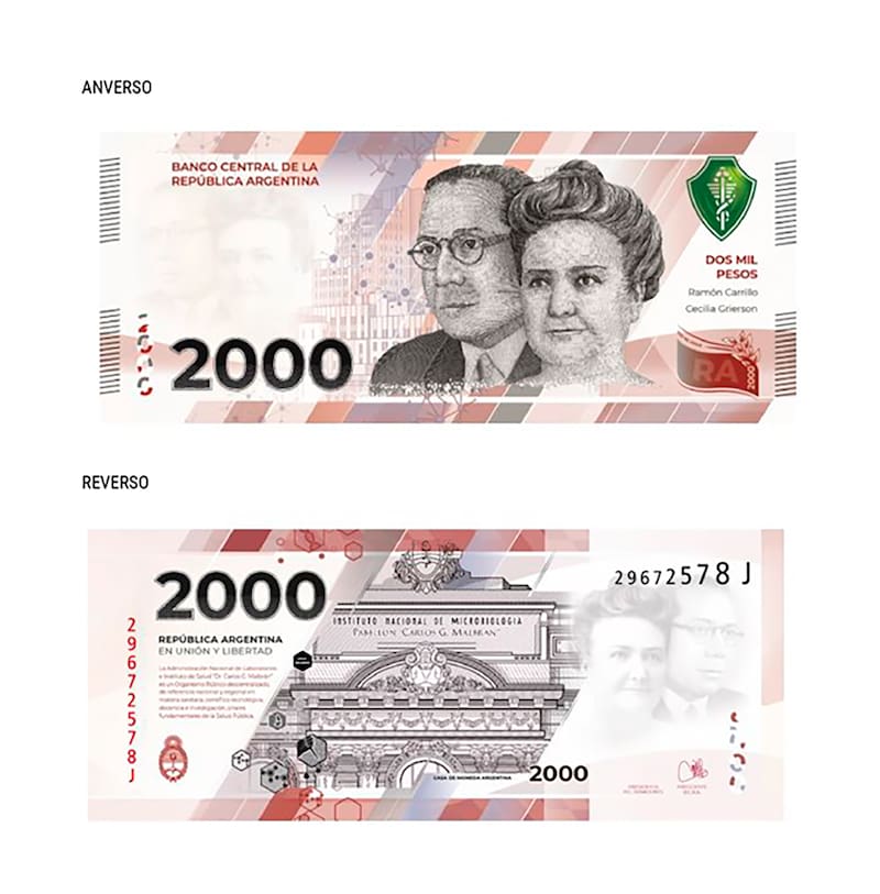 El nuevo billete de $2.000 eligió a las figuras de los médicos argentinos Cecilia Grierson y Ramón Carrillo para ilustrar el anverso del billete, mientras que el reverso tendrá un homenaje al Instituto Nacional de Microbiología doctor Carlos Gregorio Malbrán.