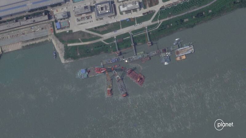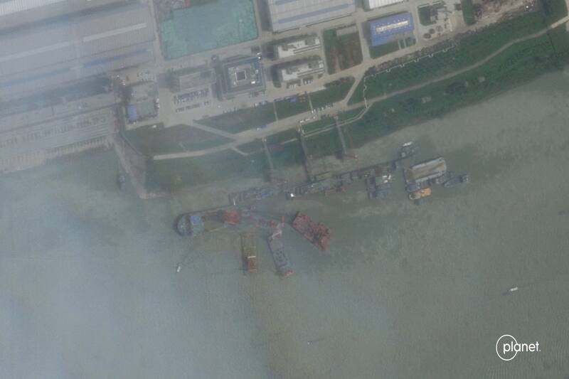 Las imágenes satelitales revelaron que a principios de junio, tras el hundimiento, llegaron grúas flotantes para rescatarlo.