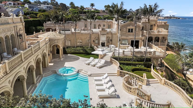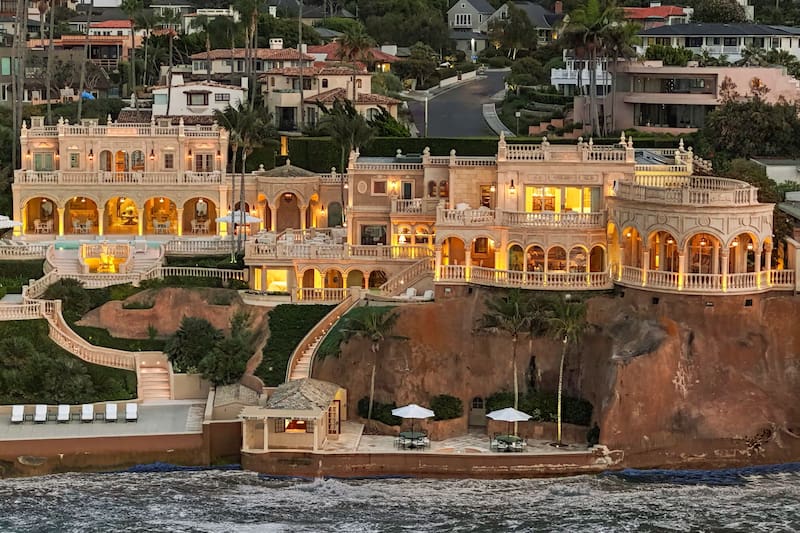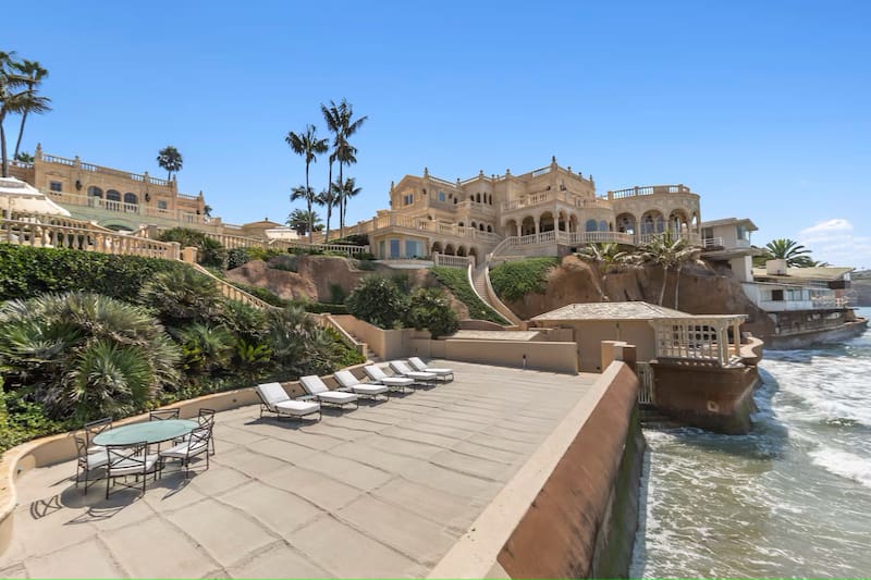 El castillo de arena, como se le conoce localmente, se ha convertido en una curiosidad con sus columnas de piedra tallada, balcones elaborados y playa privada elevada. Ahora, a la venta por 108 millones de dólares, la casa de aproximadamente 1.200 metros cuadrados rompería el récord del condado de San Diego si alcanza su precio de venta, según los agentes inmobiliarios Brett Dickinson y Ross Clark de Compass.